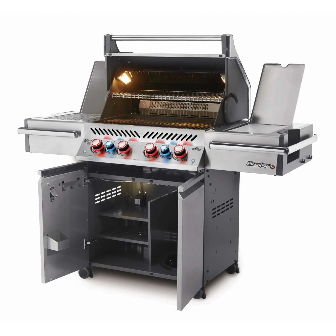 – Premium-Seitenablagen aus Edelstahl mit integriertem Getränkehalter und Eis/Marinadenfach mit Schneidebrett, verchromten Handtuchhaltern und Besteckhaken